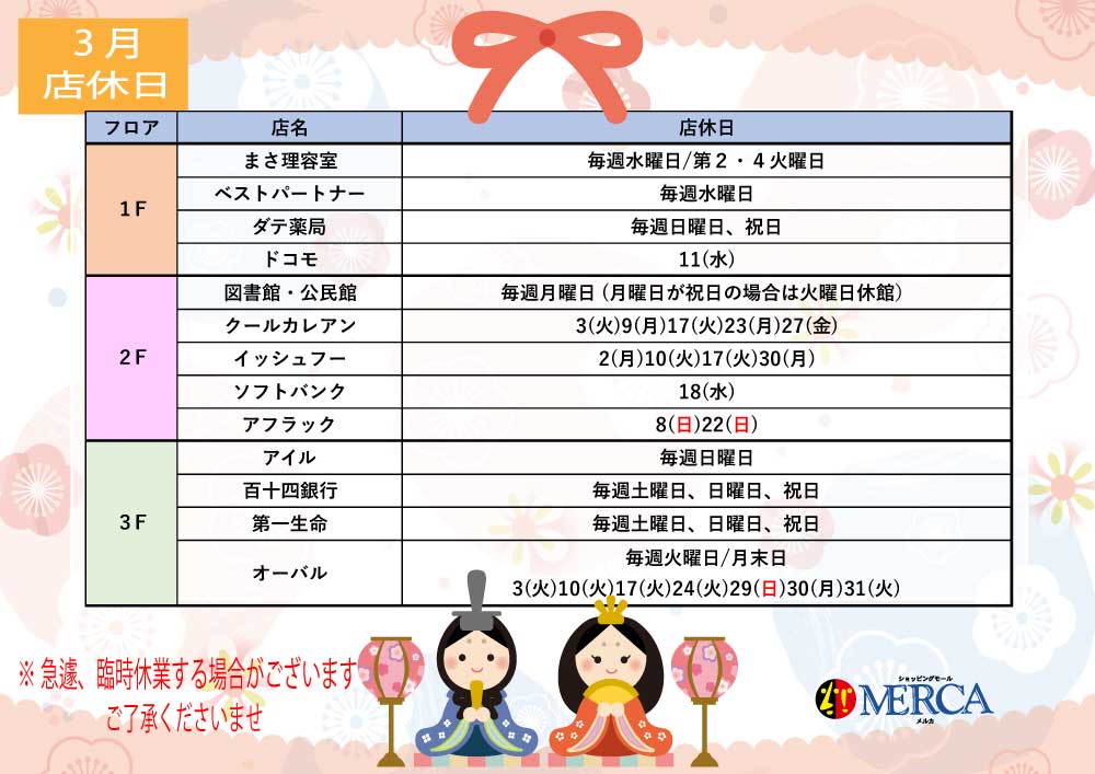 メルカからのお知らせや店休日などを随時更新しております。
